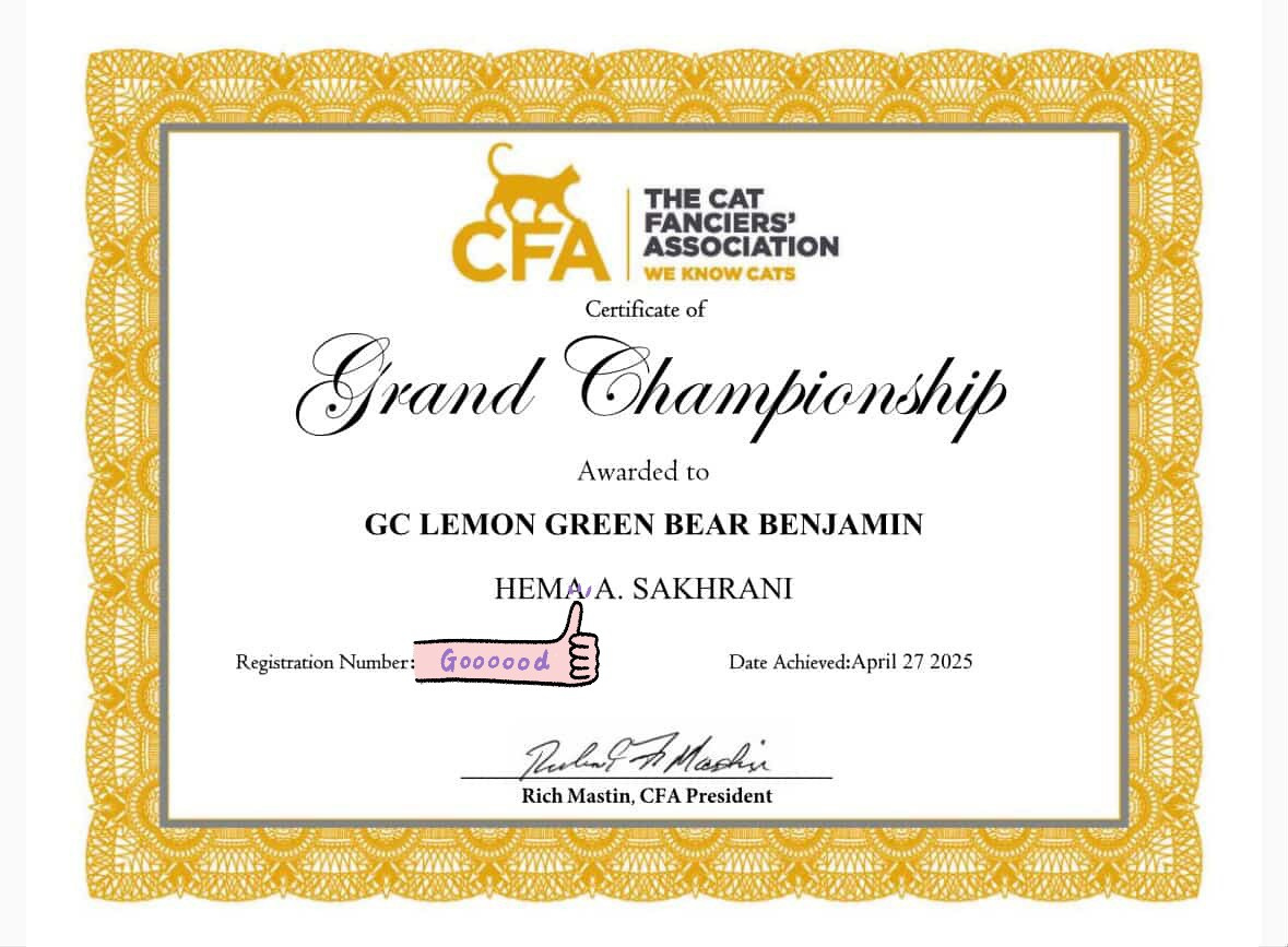LEMON GREEN BEAR BENJAMIN (1 SHOW GRAND with 160 points )BROWN MACTABBY EXOTC LONGHAIR MALE into all finals. The Best Longhair Champion by Grace Cheung 2nd Best Longhair Champion by Edward Maeda 5th Best Allbreed Champion by Edward Maeda 3rd Best Longhair Champion by Suki Wong. 4th Best Allbreed Champion by Suki Wong 5th Best Longhair Champion by Chris Merritt 4th Best Longhair Champion by John Webster A big show with 150 cats! Very tough and challenging but We still got these wonderful results ❤️ Thanks to all owners for taking great care of them, alMaggie Kwan Dolly-Chinyan Dolly-Chiny for grooming Bear in top condition! Thanks to all judges who loved my cats and the organizer who held this great show!